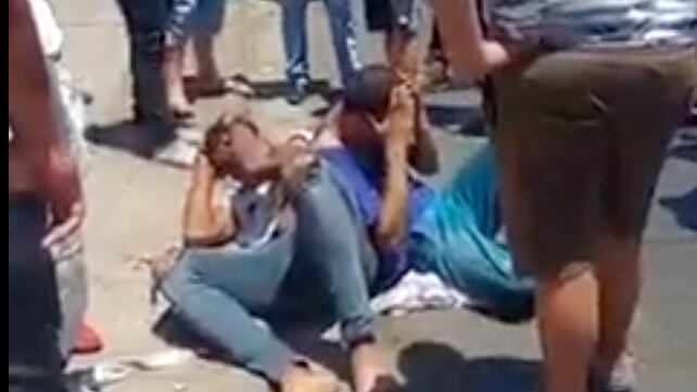 Es así que los pasajeros del bus persiguieron a los delincuentes hasta que los detuvieron y golpearon en el suelo.