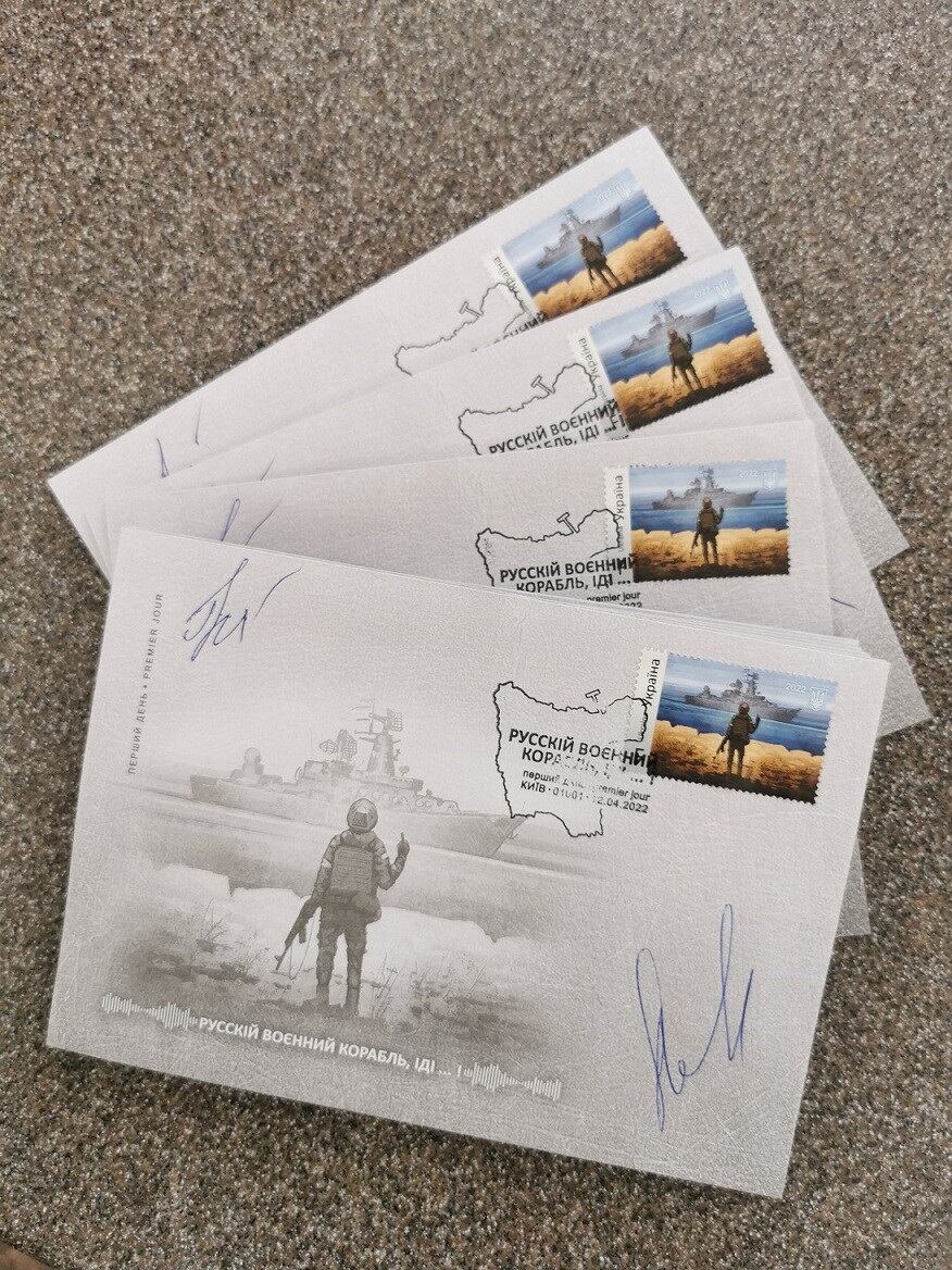 Ukrposhta ha publicado así un millón de sellos de tirada bajo el título «¡Buque de guerra ruso, vete a la mierda!» que se refiere en particular a los guardias de fronteras de la isla de la Serpiente, tomada por las fuerzas rusas en los primeros días de la invasión rusa.
