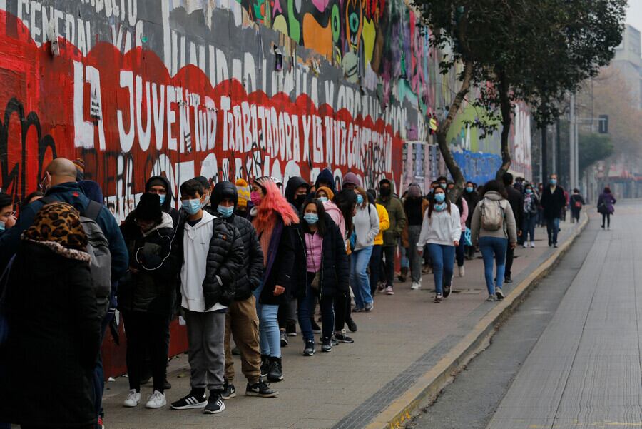 Es el caso del centro de vacunación instalado en el centro cultural GAM, en Alameda 227, en la comuna de Santiago, donde se ha formado una extensa fila que está dando vuelta la cuadra por calle Namur.