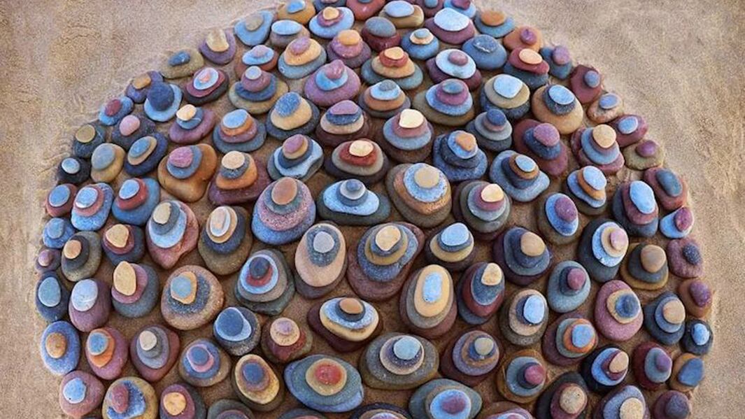 Él las utiliza para formar increíbles obras maestras en las playas del Reino Unido, donde encuentra rocas de todas las formas y tamaños y las dispone en diseños hipnóticos.