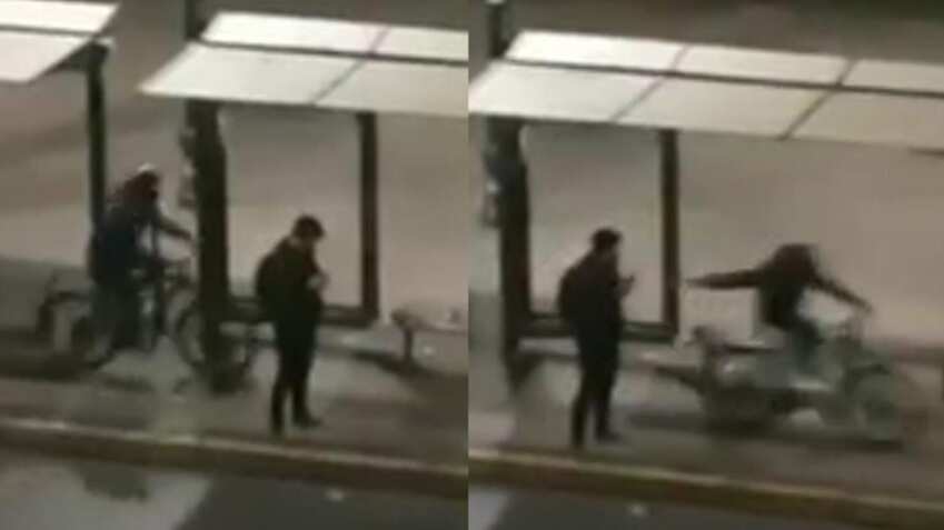 Las cámaras de seguridad mostraron al sujeto, proveniente República Dominicana asechando a su víctima que se encontraba con el celular en sus manos, en un paradero de micros, en el sector de la Alameda con Av. Portugal. El delincuente pasa en la bicicleta y se devuelve, al ver que era una presa fácil.