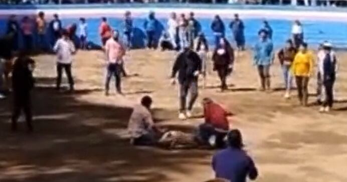 “Los ojos tapaditos, por favor, los papás”, dice el animador, advirtiendo que las imágenes pueden ser muy fuertes para los menores. “Pónganse un polerón o algo chiquillos”, insistía el locutor, mientras se escuchan los chillidos del animal, que es sujetado de las patas por dos hombres.