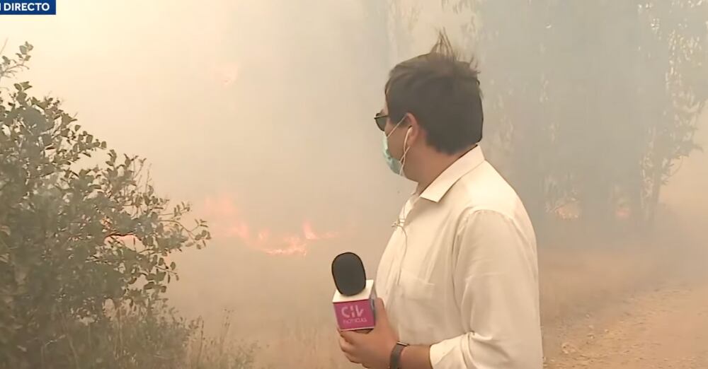 Ellos se encontraban dentro del fundo Agrosuper, cuando un foco de incendio empezó a prenderse con más intensidad a medida que pasaban los segundos. El reportero advirtió al camarógrafo por el fuego e informó que se iban a alejar de la locación en donde se encontraban.
