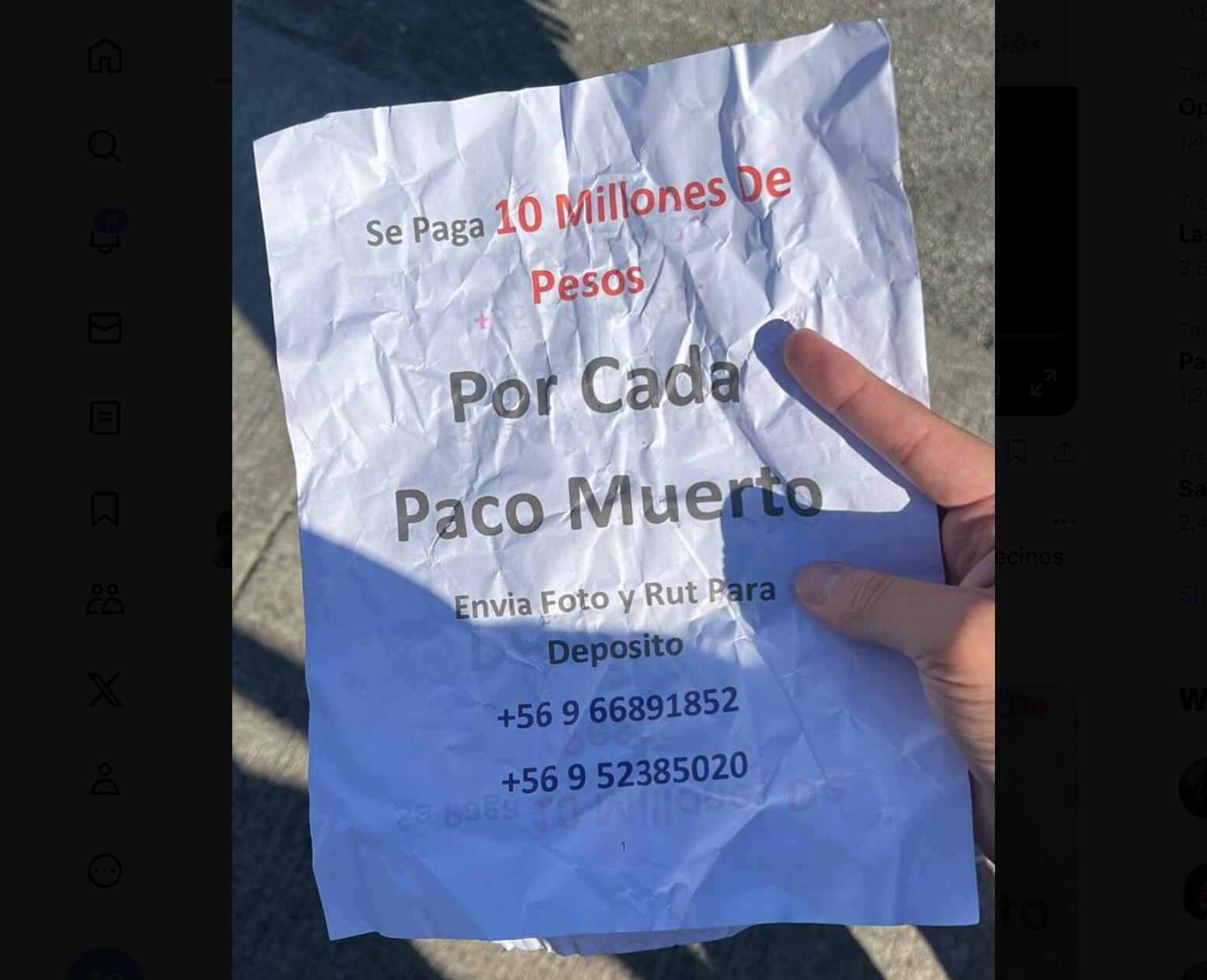 “Se paga 10 millones de pesos por cada paco muerto”, es lo que dice en letras rojas un macabro panfleto que comenzó a circular en las calles de Coronel, en la región del Biobío, hecho que ya es investigado por Carabineros, mientras que el gobierno a través de la Delegación Presidencial condenó el aviso.
