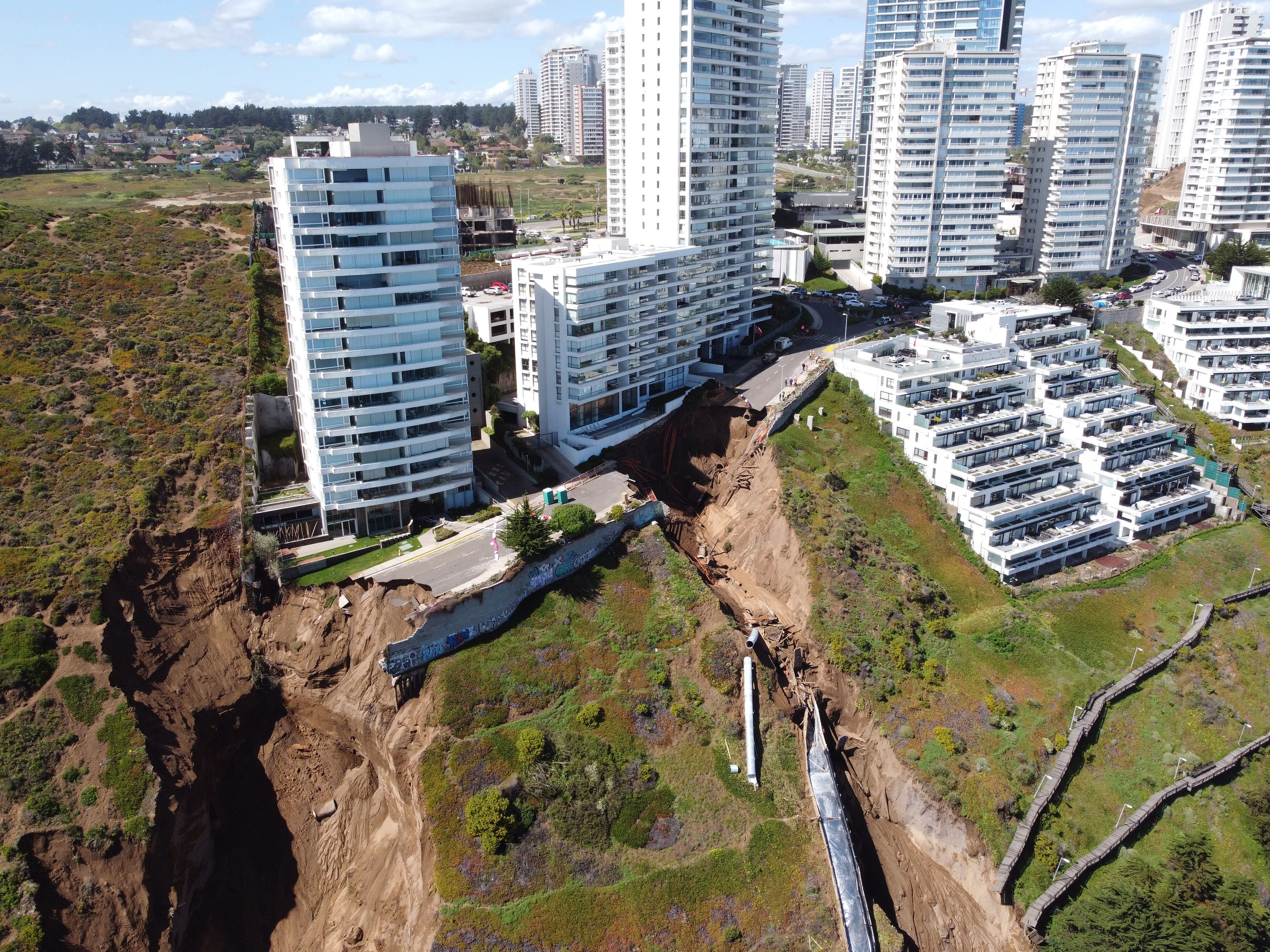 Recordemos que fue durante unas intensas lluvias en la región de Valparaíso que se produjeron dos enormes socavones que afectaron a los edificios Kandinsky, Miramar y Santorini. Los tres complejos habitacionales están construidos sobre las dunas de Viña del Mar.