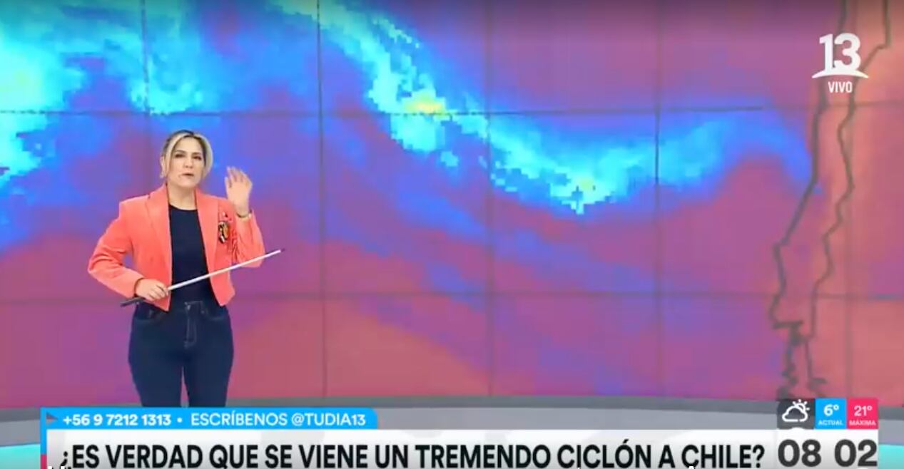 “Esto llega la proxima semana, entre lunes y martes comienza a cercarse al territorio nacional (...) Hay un área de baja presión el día sábado al frente de nuestro país y va desde la altura de Antofagasta y abajo alcanza la región de Aysén. Imagínense la gran extensión que tiene, esto es mucho, es muy grande”, indicó Michelle Adam.