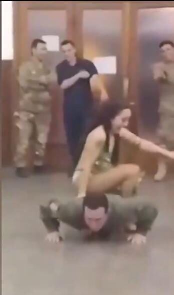 En otro momento del video también se puede ver que otro soldado realizaba flexiones con la otra bailarina sentada en su espalda mientras seguía sonando la música. “Uno, dos, tres, cuatro...”, contaba el animador en medio de las risas de los militares.