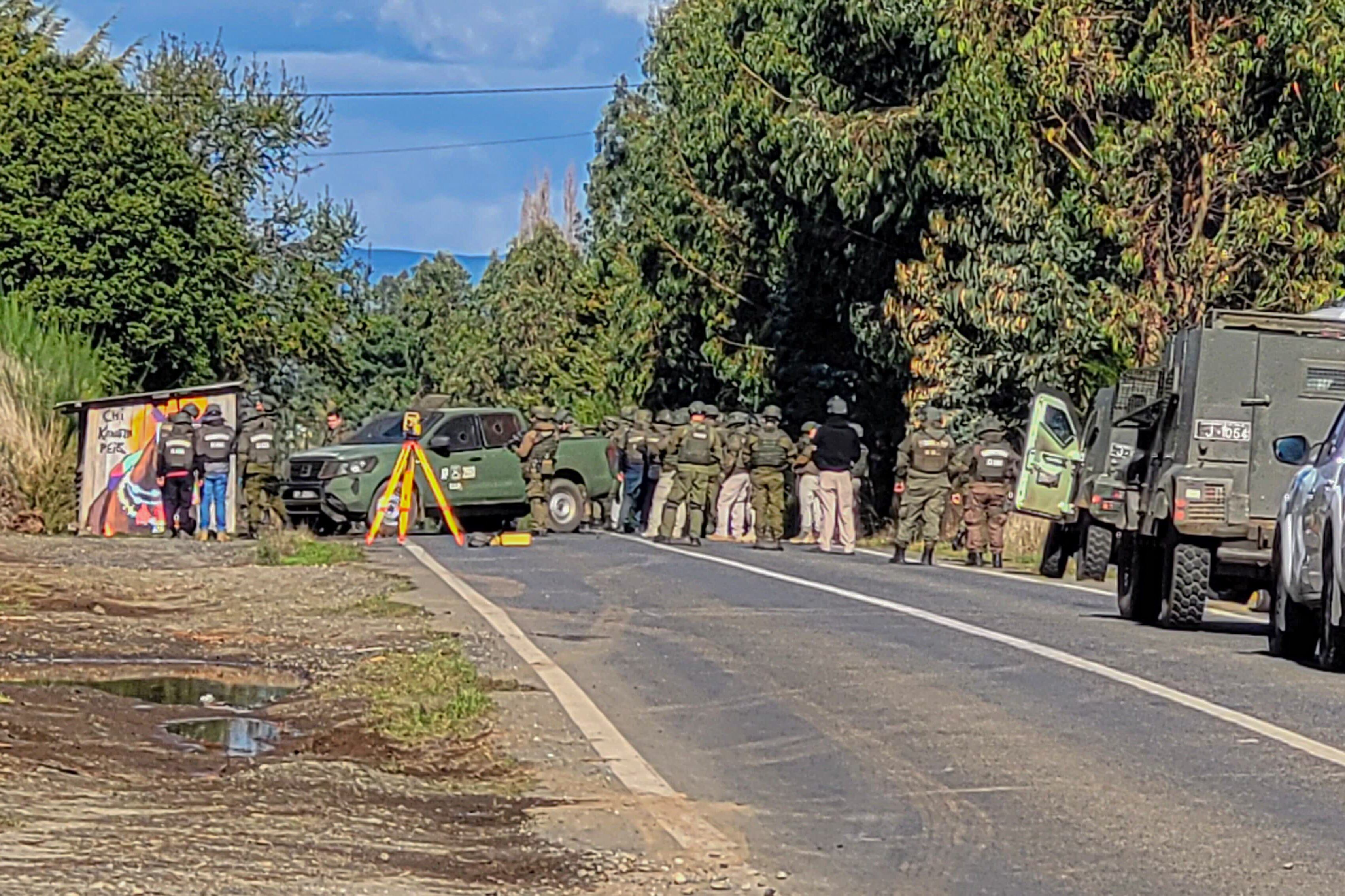 “Están los tres muertos. Están los tres muertos atrás. Ahí están los tres muertos”, se escucha decir a uno de los uniformados que llegó hasta la ruta que une Tirúa con Cañete.