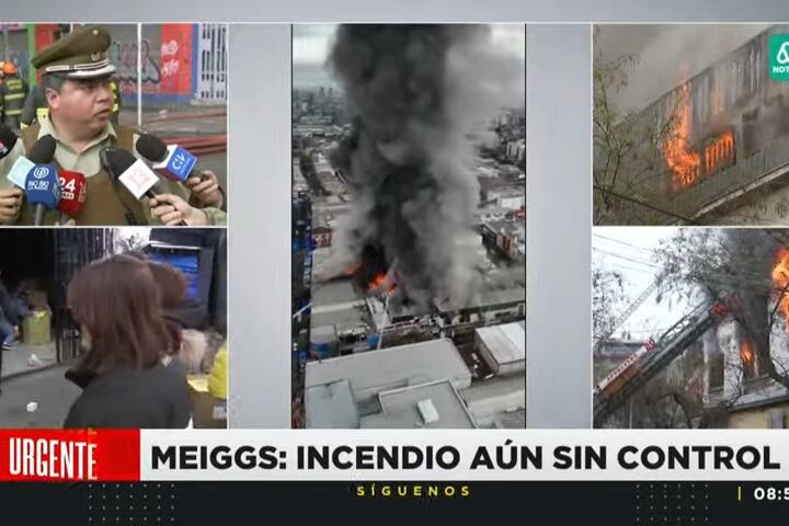 Un voraz incendio consume este domingo por la mañana buena parte de los locales comerciales ubicados en la galería San Alfonso del barrio Meiggs, en la comuna de Santiago, como consecuencia del posible robo de un cajero automático.