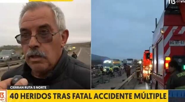 “Yo desperté y el bus que está volcado, obviamente volcó a un costado de la carretera sin mayores consecuencias para los pasajeros, y producto de esto se generó toda esta situación posterior que fue el choque por alcance del Pullman al vehículo volcado”, explicó a T13.
