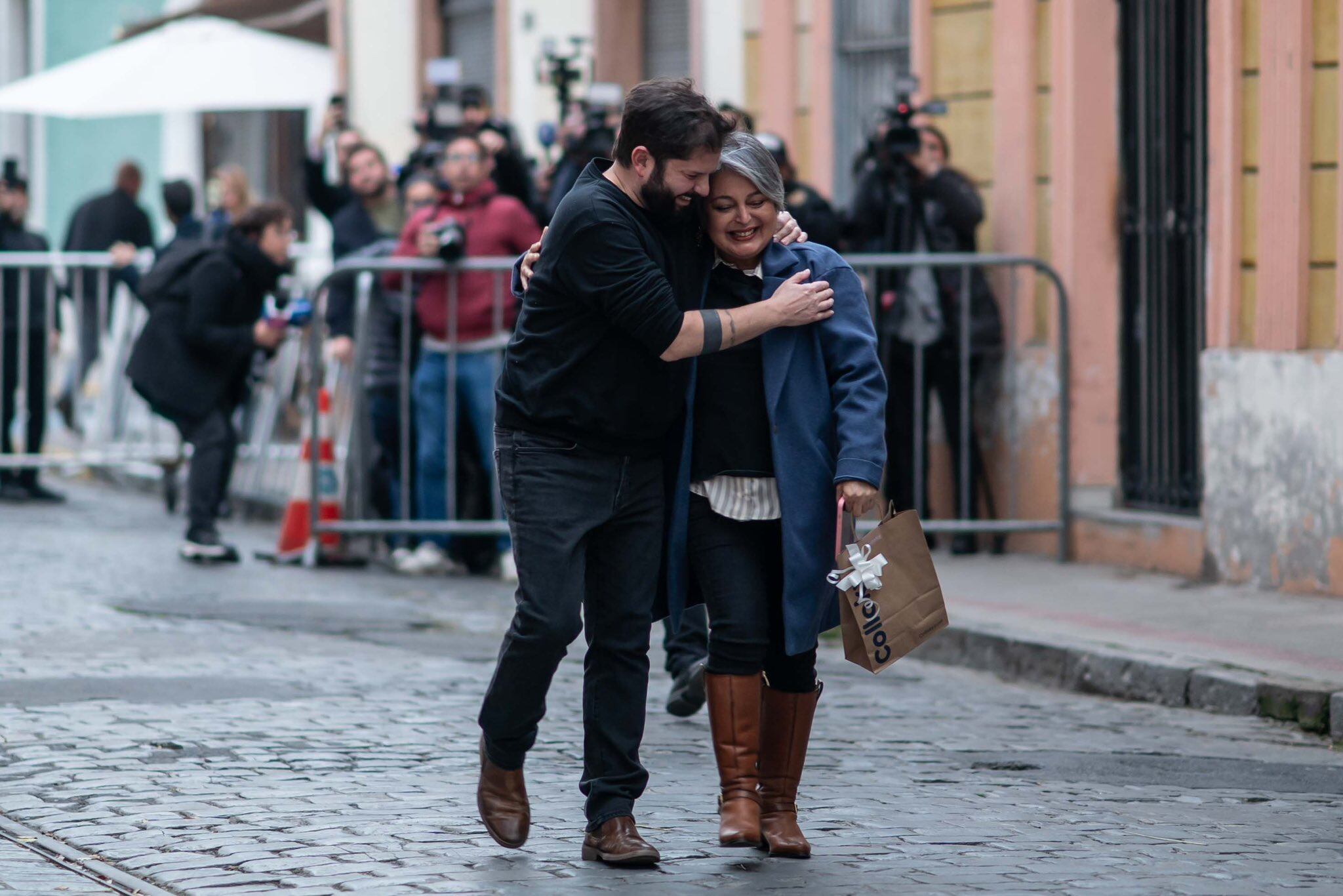 Con un fraternal abrazo, el presidente de la República, Gabriel Boric, saludo a la candidata presidencial del oficialismo, Jeannette Jara, luego que la abanderada comunista visitara la casa del mandatario en el barrio Yungay de la comuna de Santiago.