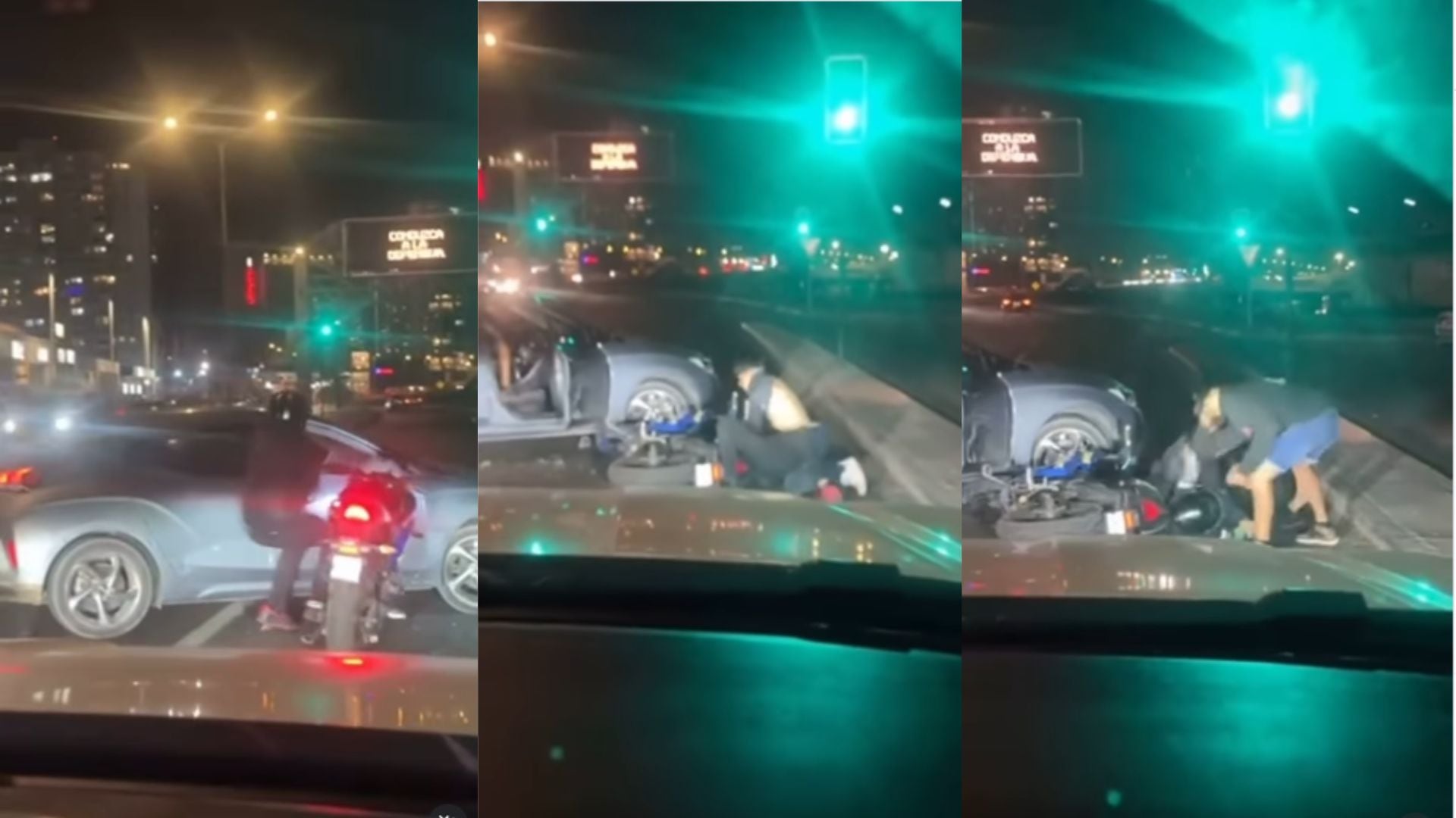 En el video grabado por un testigo se observa cómo los ocupantes del automóvil descienden del vehículo y se dirigen hacia el motociclista, quien se encontraba con casco. Posteriormente, comenzaron a golpear al conductor de la motocicleta, sin que se advierta intervención inmediata de terceros para separar a los involucrados.