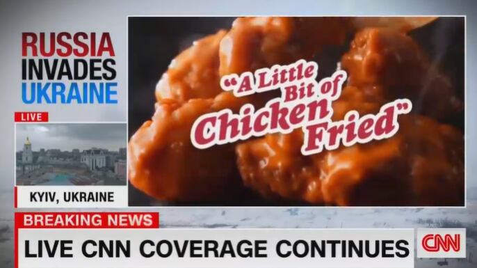 En momentos que se mostraba en pantalla el ruido de las sirenas en Kiev, apareció sorpresivamente un comercial de Applebee’s, la conocida cadena de restaurantes.