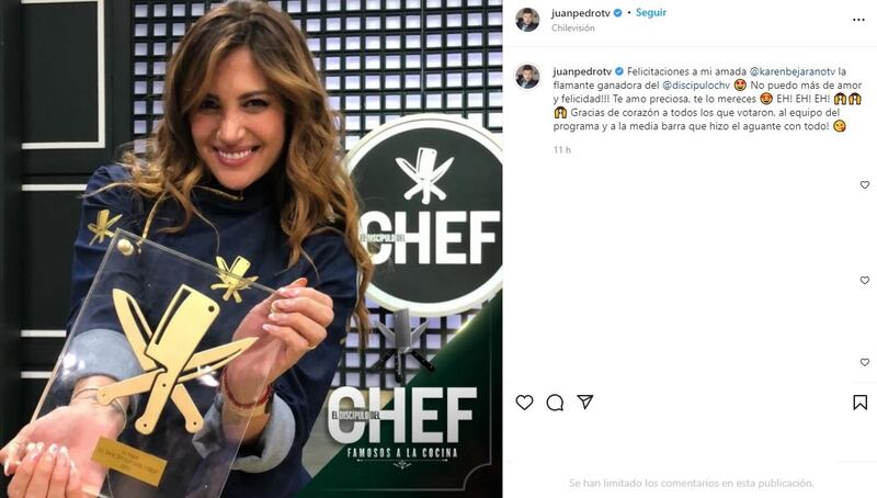 Luego de concretarse la victoria de Bejarano en el estelar culinario de CHV, y tras los festejos de rigor en el estudio de TV donde se llevó a cabo la competencia final entre la exMekano, Daniela Aránguiz y Vanesa Borghi, la pareja de la figura televisiva se volcó a su cuenta de Instagram para redactar una publicación que acompañó de una postal de Karen con el trofeo de vencedora.
