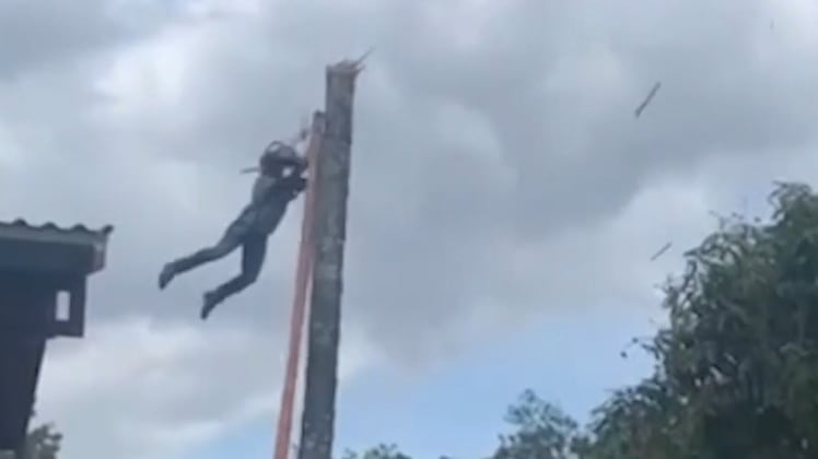 El registro, el cual se viralizó en redes sociales, muestra al hombre que estaba sobre una escalera apoyada al árbol, mientras que estaba sujeto a un arnés.