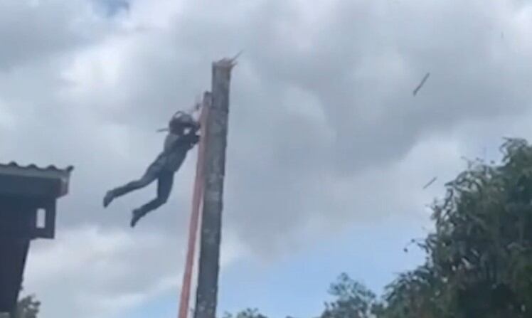 El registro, el cual se viralizó en redes sociales, muestra al hombre que estaba sobre una escalera apoyada al árbol, mientras que estaba sujeto a un arnés.