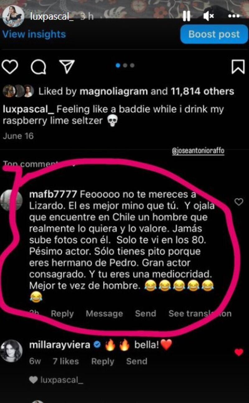 Fue a través de sus Stories de Instagram que la hermana de Pedro Pascal expuso las palabras de la mujer, quien partió criticando su relación amorosa con el actor José Antonio Raffo, su vínculo de sangre con el protagonista de “The Mandalorian” y sus capacidades actorales.