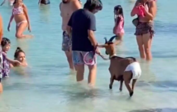 Lo hemos visto todo. En un video que se viralizó en redes sociales, llamó la atención la particular visita que llegó a Totoralillo. una cabra con pañales en el agua.