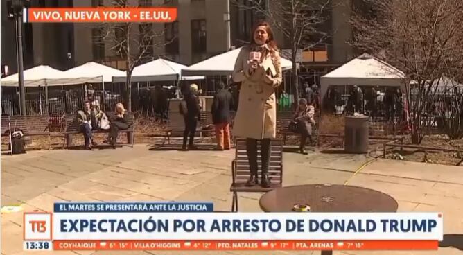 Durante la última emisión de T13 tarde, la periodista se encontraba explicando el complejo momento que vive el expresidente de Estados Unidos, Donald Trump, quien enfrentará a la justicia por diversos cargos penales y podría ser arrestado.