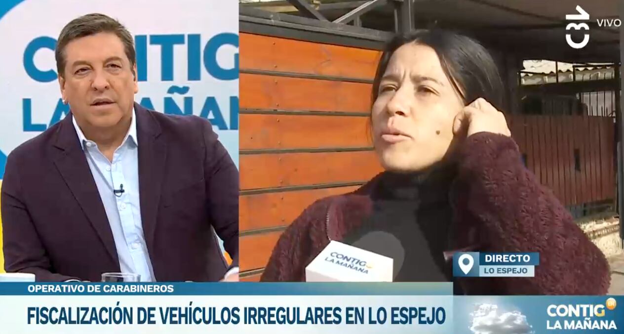 Carabineros realizaba una fiscalización de Carabineros a automóviles y motos en la comuna de Lo Espejo, cuando una vecina irrumpió molesta en la transmisión de “Contigo en la Mañana”, que mostraba si los conductores cumplían con los documentos. “Esta no es la verdad de la comuna, ¿una fiscalización de un auto?”, dijo la mujer, que se identificó como Mariana.