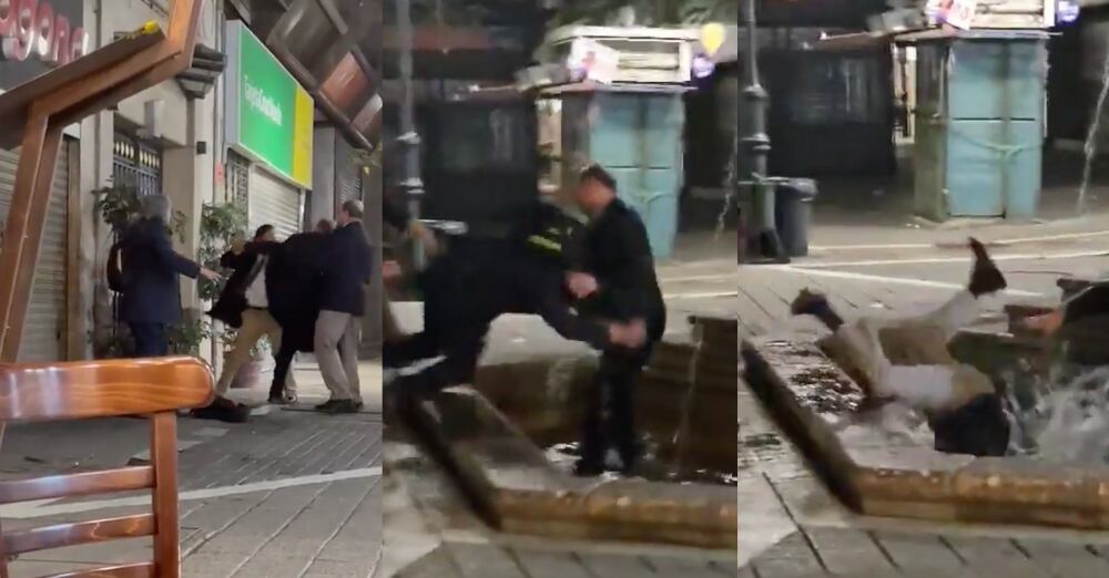 La pelea se terminó yendo de las manos cuando lanzaron a uno de los hombres a una pileta. Mientras el hombre que cayó al agua se estaba levantando, otro lanzó al que estaba más cercano a la pileta, y sus malas intenciones lo arrastraron al agua también, aterrizando de cabeza a la fuente.
