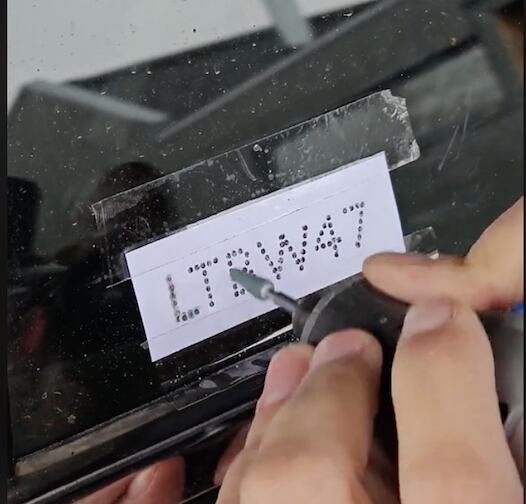 Para eso se debe tener un dremel, imprimir la patente en una hoja y con una aguja, romper punto por punto de las letra. Así luego se pega con cinta adhesiva al vidrio, y con el dremel y extremado cuidado, grabarlo.