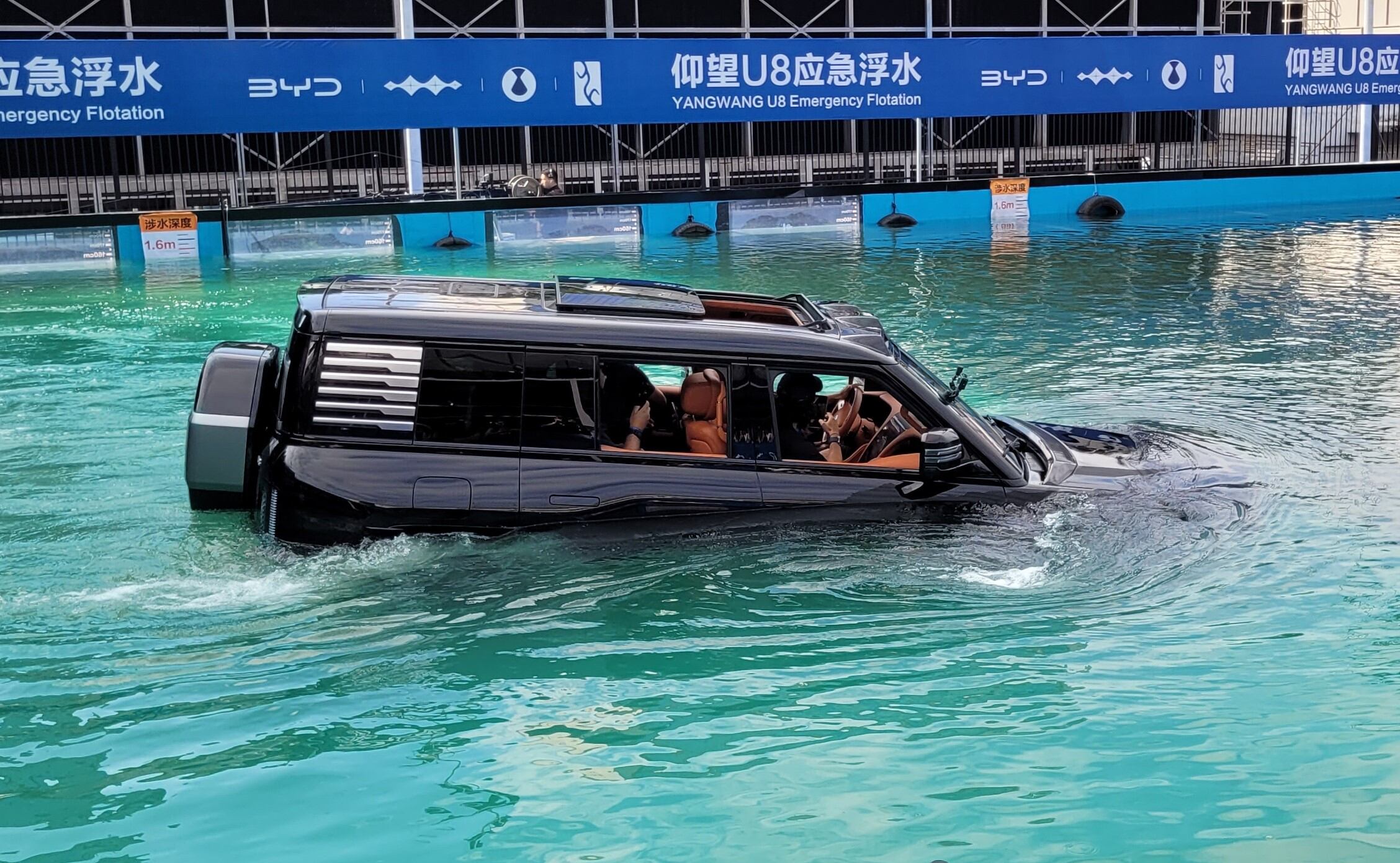 BYD también aclara que, tras activar el modo flotante, es obligatorio llevar el vehículo a un centro de servicio para una revisión. En una demostración efectuada en el Salón de Guangzhou, comprobamos que el habitáculo del YangWang U8 es estanco y que la “navegación” es bastante fluida gracias a que el modelo tiene un motor eléctrico en cada rueda, lo que le permite avanzar. El U8 navega ligeramente encabuzado debido al peso del motor a combustión delantero y claramente no soportaría oleaje muy intenso.