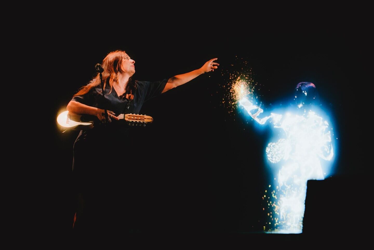La sorpresa -que emocionó a todos los asistentes- se dio justamente con los primeros acordes de Gracias a la vida, instante en el que al lado de Javiera Parra apareció el holograma de su abuela, Violeta Parra, en una imagen que probablemente es la más recordada de la fallecida artista, ya que apareció frente a todos cargando su característica guitarra.