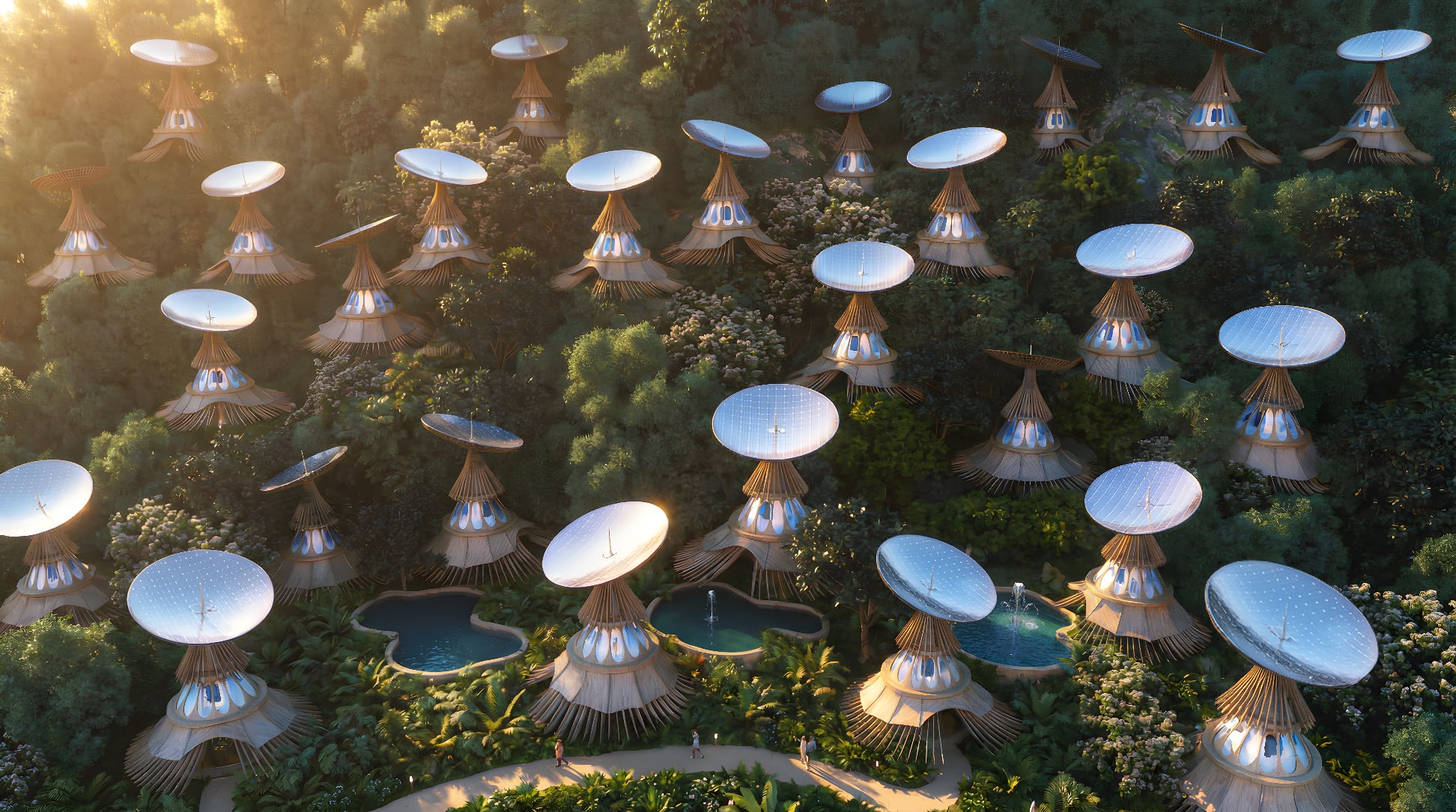 En un modelo arquitectónico desarrollado por MASK Architects, cada módulo habitable está coronado por un espejo parabólico cóncavo de doble eje que sigue el movimiento del sol en tiempo real.